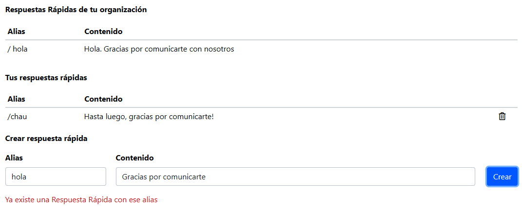 En la parte inferior podrá crear respuestas rápidas definiendo un alias y agregando el contenido. Al finalizar haga click en el botón "Crear" y la respuestas rápidas aparecerá en la lista.